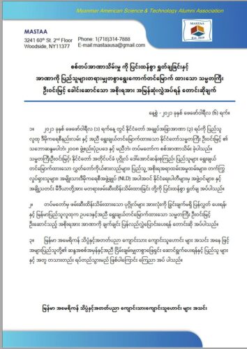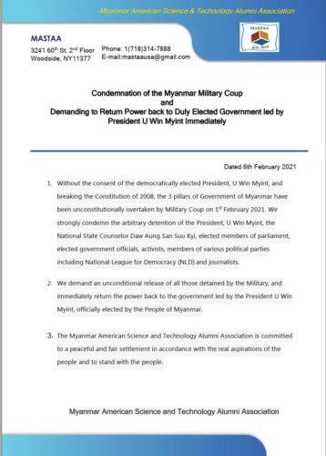 MASTAA strongly condemns the unconstitutional military coup of February 1, 2021, demands the immediate release of detained leaders including President U Win Myint and Daw Aung San Suu Kyi, and urges the return of power to the duly elected civilian government in line with the will of the people.
