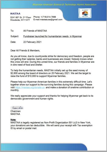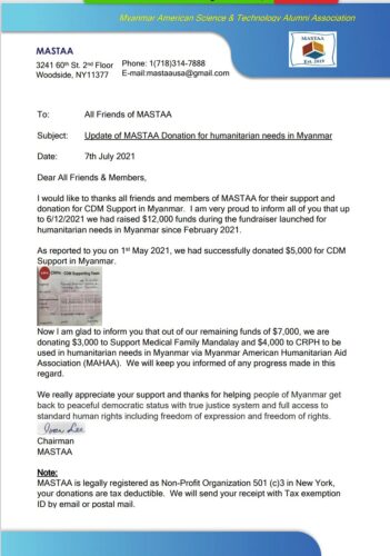 MASTAA extends heartfelt thanks for your generous contributions, sharing that $12,000 has been raised since February 2021, with donations now directed to support CDM, Medical Family Mandalay, and CRPH through MAHAA to aid humanitarian efforts in Myanmar.