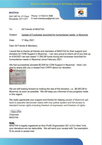MASTAA gratefully reports raising over $11,000 for humanitarian support in Myanmar since February 2021, with $5,000 already donated to CDM efforts and the remaining funds planned for further aid distribution.