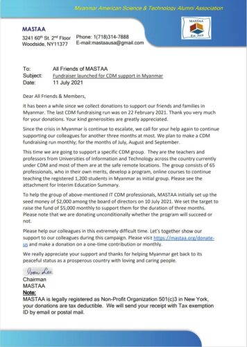 MASTAA is calling for renewed financial support to assist 65 CDM university educators in Myanmar who have developed and launched volunteer-led online courses for 1,200 students, aiming to sustain this effort over three months.