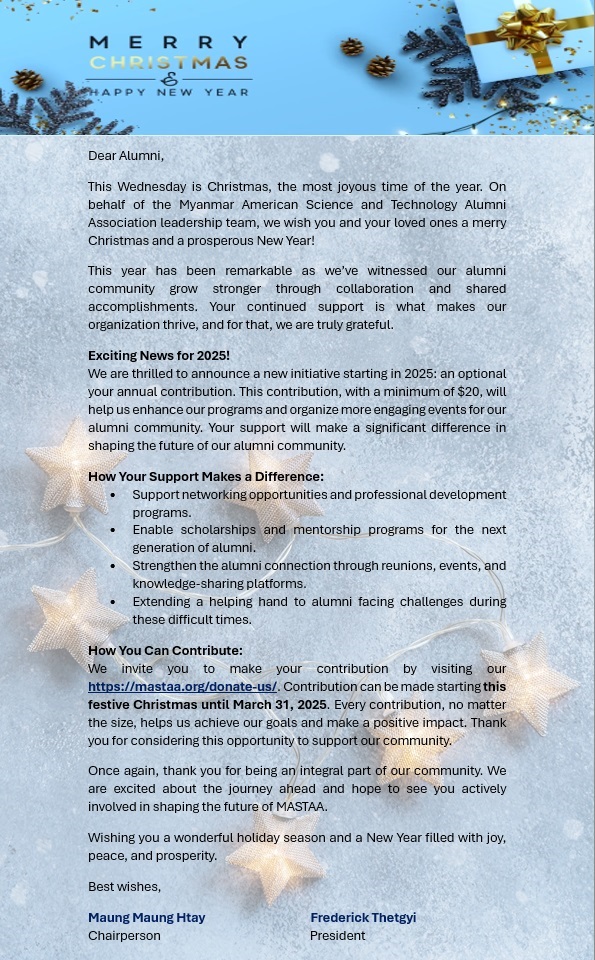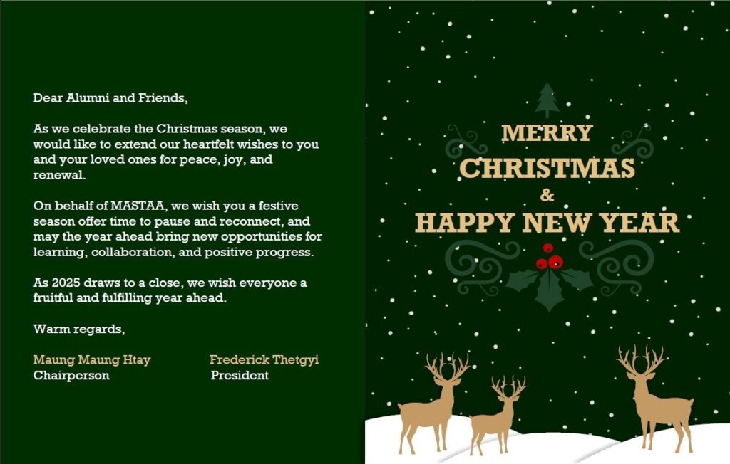 MASTAA is pleased to share its Christmas and New Year wishes, sent on December 23, 2025 in a joint message from the Chairperson and President to alumni and the MASTAA community. The message extended heartfelt wishes for peace, joy, and renewal during the festive season, and expressed hope for a fruitful and fulfilling year ahead with continued opportunities for learning, collaboration, and positive progress.